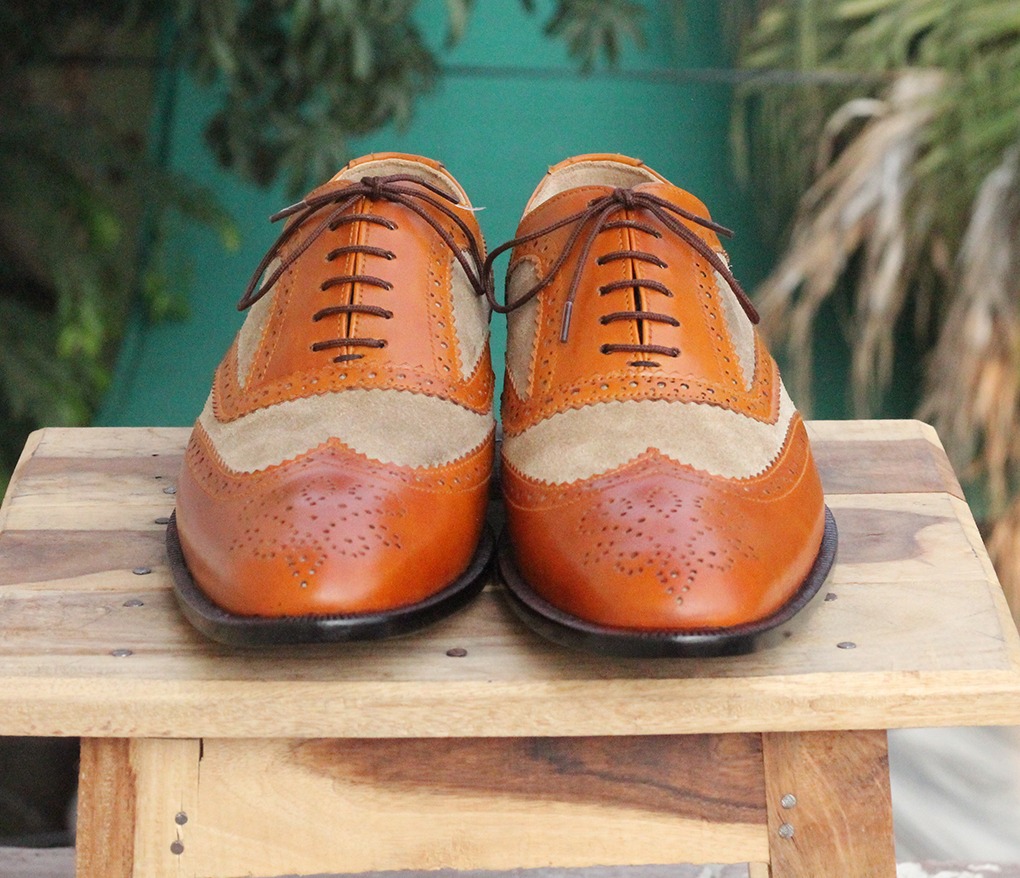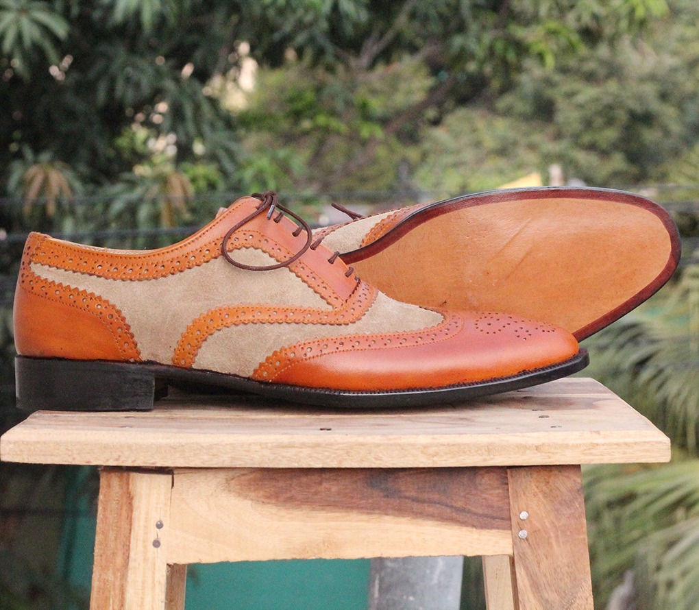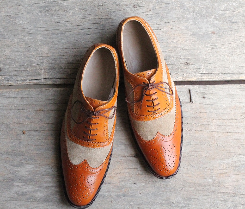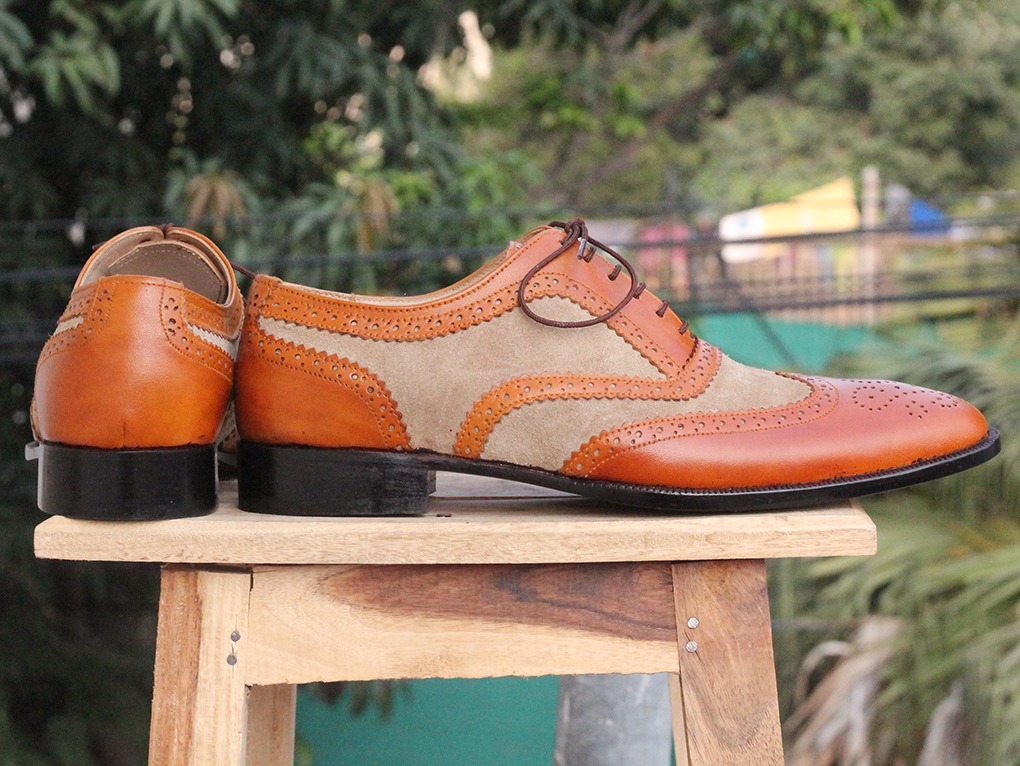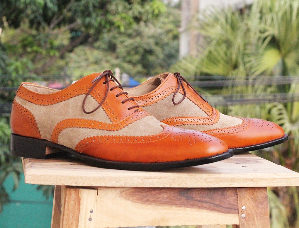 Spectator dress shoes for men suede leather. Handmade men tan and white shoes.