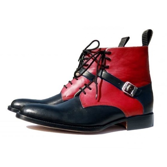 Handmade Black Red Leather Buckle Boots. Mens High Ankle Boots