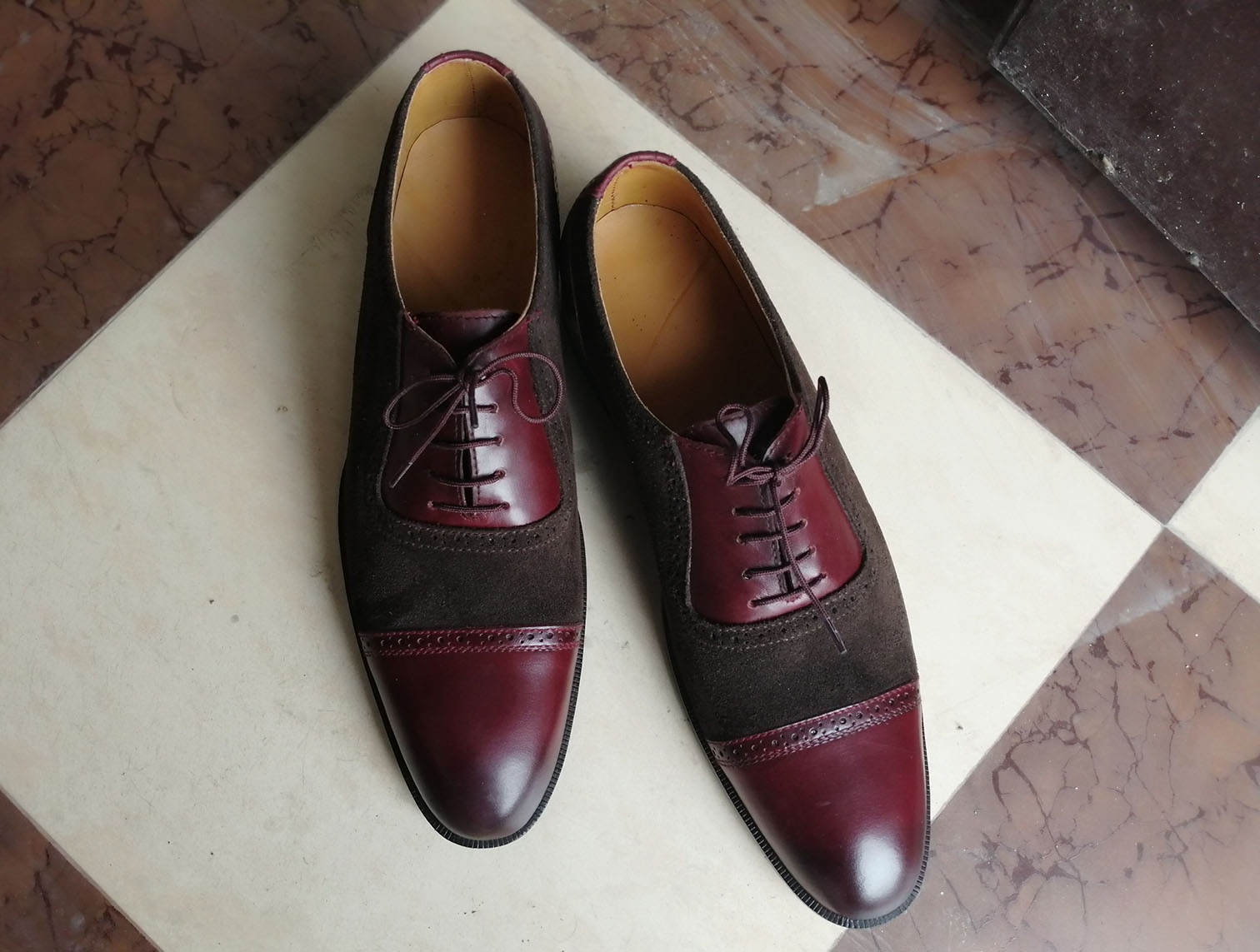 Handmade Brown Burgundy Cap Toe Lace Up Leather Suede Shoes, Stylish Dress Formal Shoes