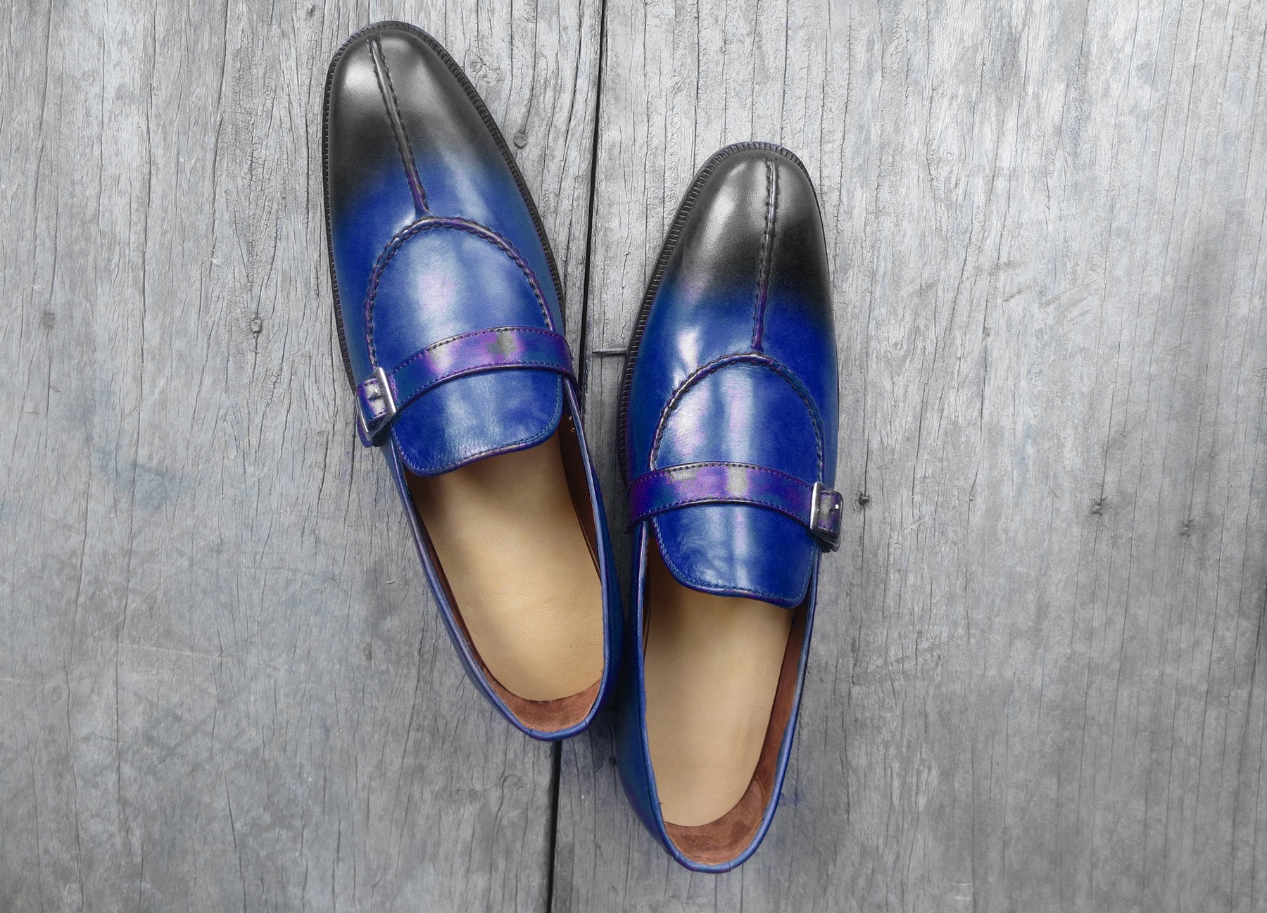 Handmade Mens Black Blue Color Shoes Stylish Split Toe Leather Monk Strap Formal Shoes