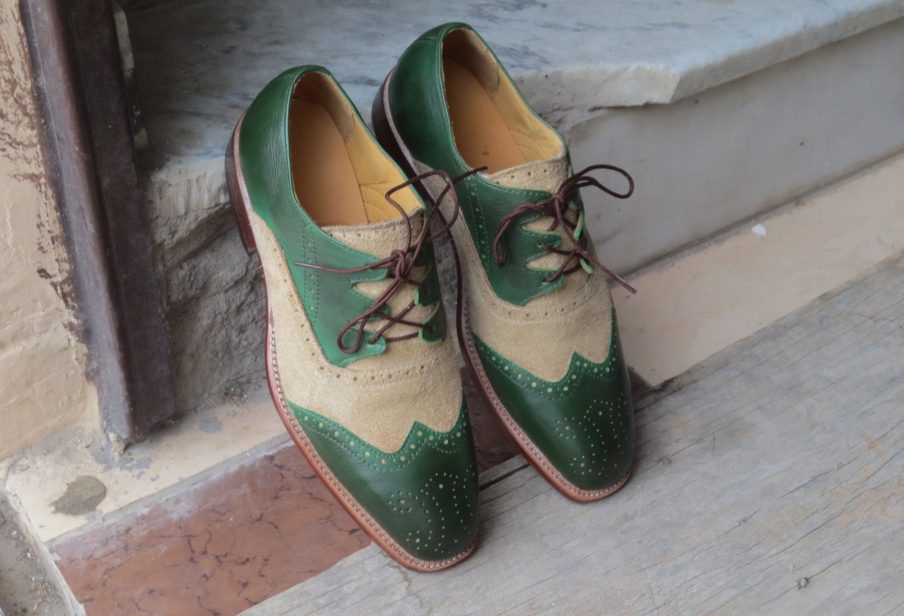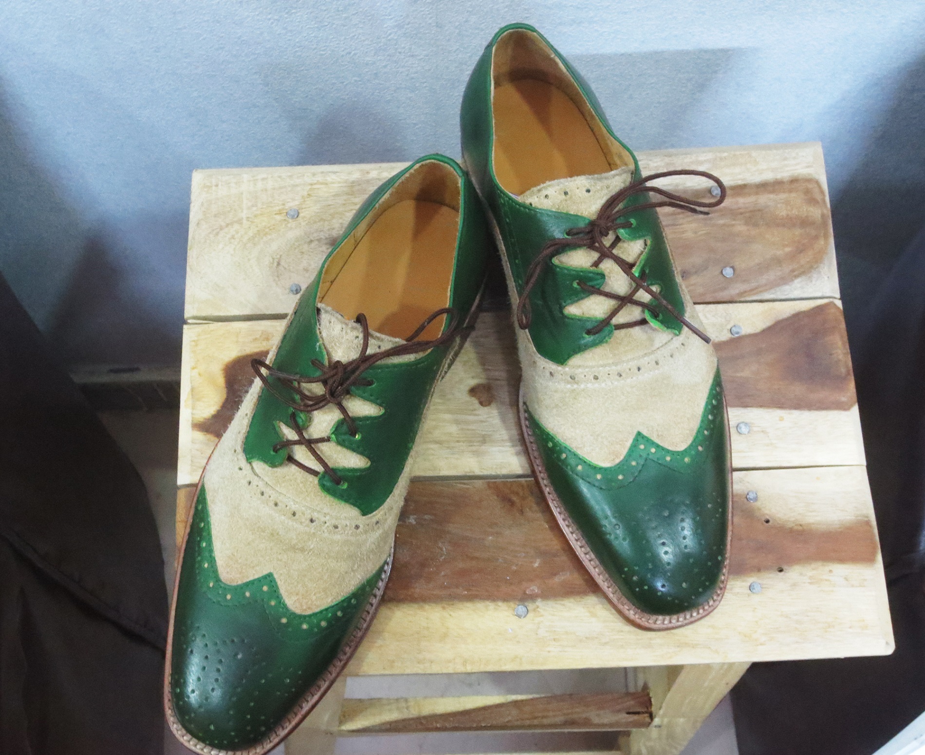 Mens Beige Green Leather Suede Lace Up Shoes. Men Dress Formal Wing Tip Brogue Shoes