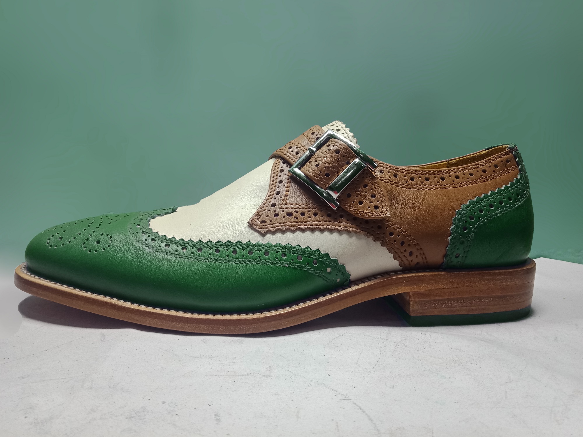 HANDMADE BROGUE MULTICOLOR LEATHER SHOES, MENS BROWN WHITE GREEN SHOES