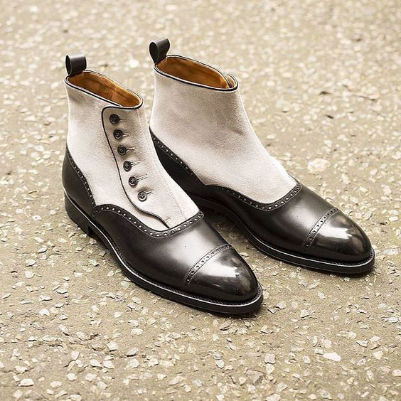 Handmade Mens Ankle Button Boot, Mens Black White Leather & Suede Cap Toe Casual Button Boot.