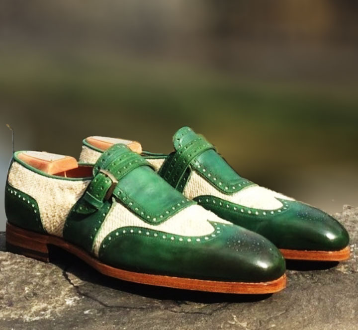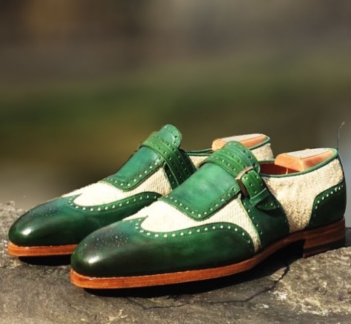Handmade Mens Beige & Green Color Single Monk Shoes, Stylish Suede & Leather Wing Tip Brogue Dress Shoes