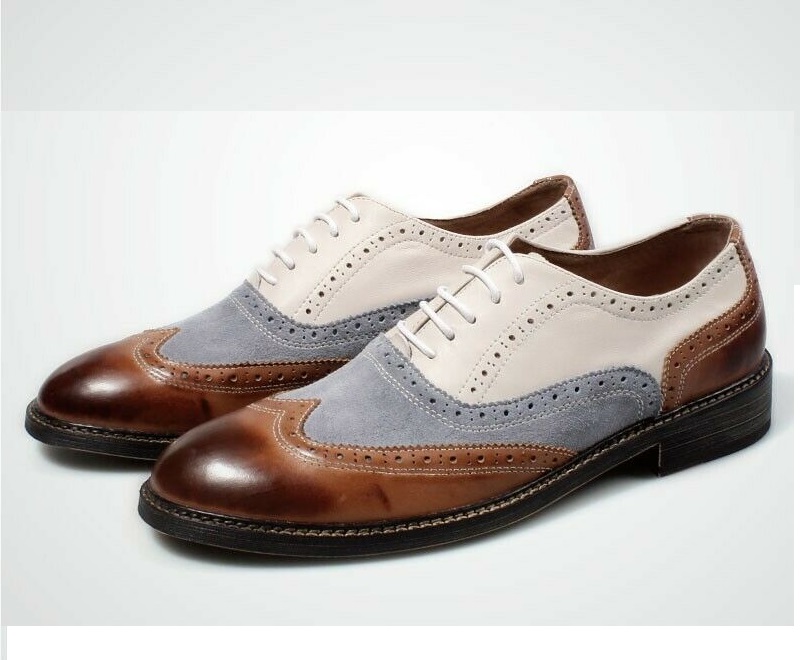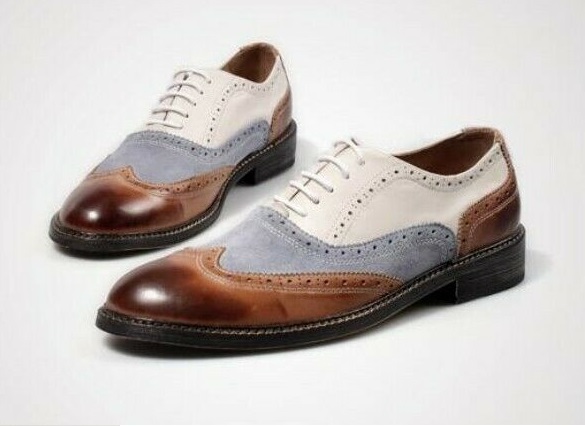 Handmade Mens White Brown Light Blue Suede Leather Shoes, Lace Up Stylish Wing Tip Dress Formal Shoes