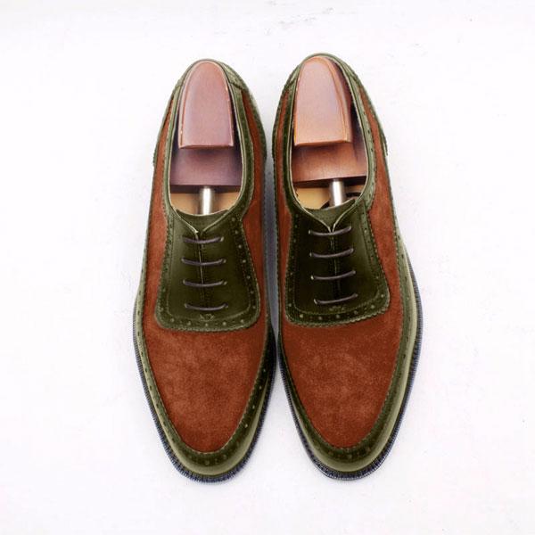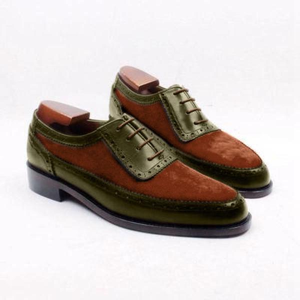 Handmade Mens Fashion Shoes, Men's Green Brown Leather & Suede Lace Up Fashion Shoes