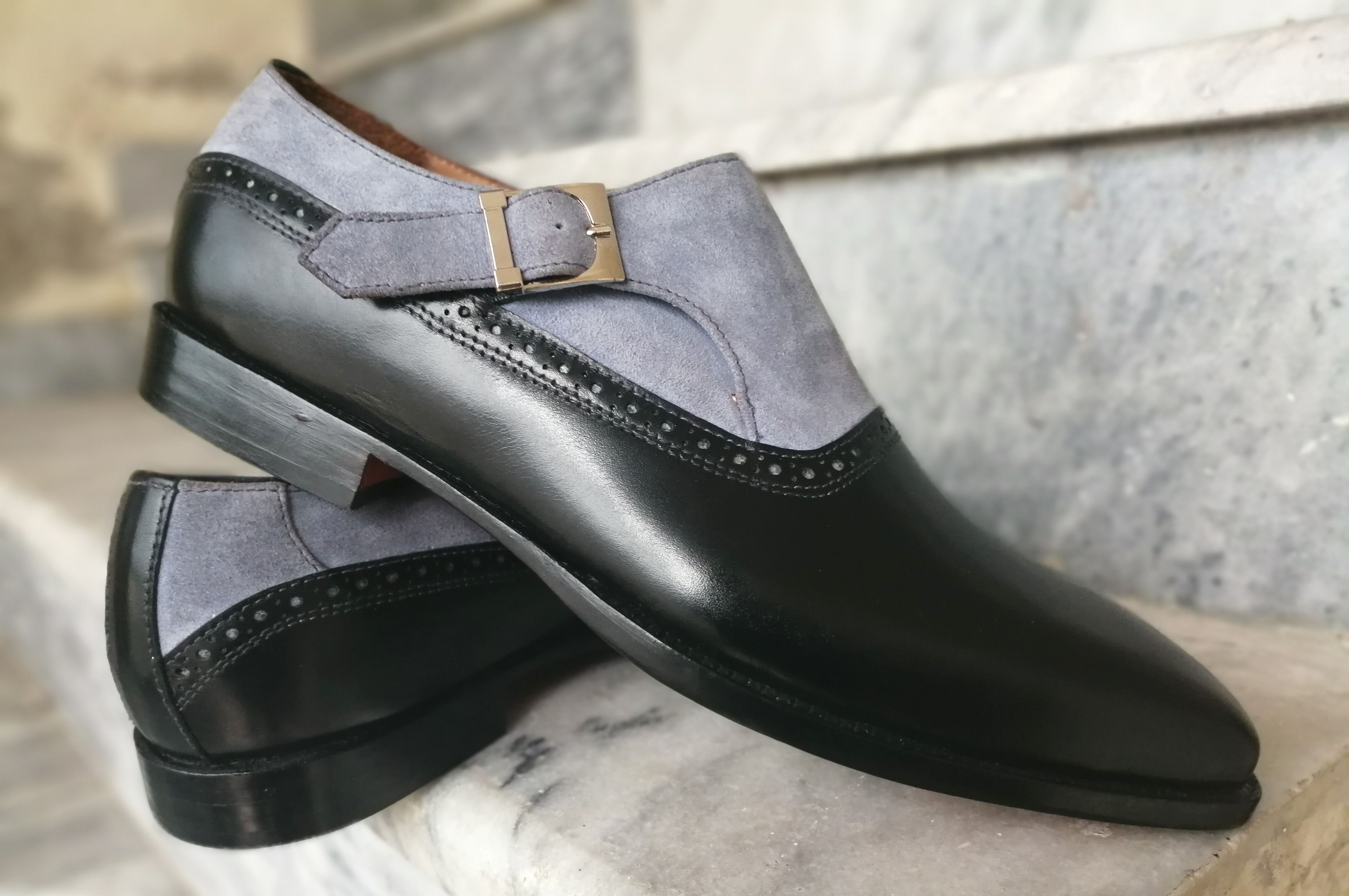 Handmade Mens Derby Monk Strap Shoes, Mens Black Gray Suede Leather Shoes