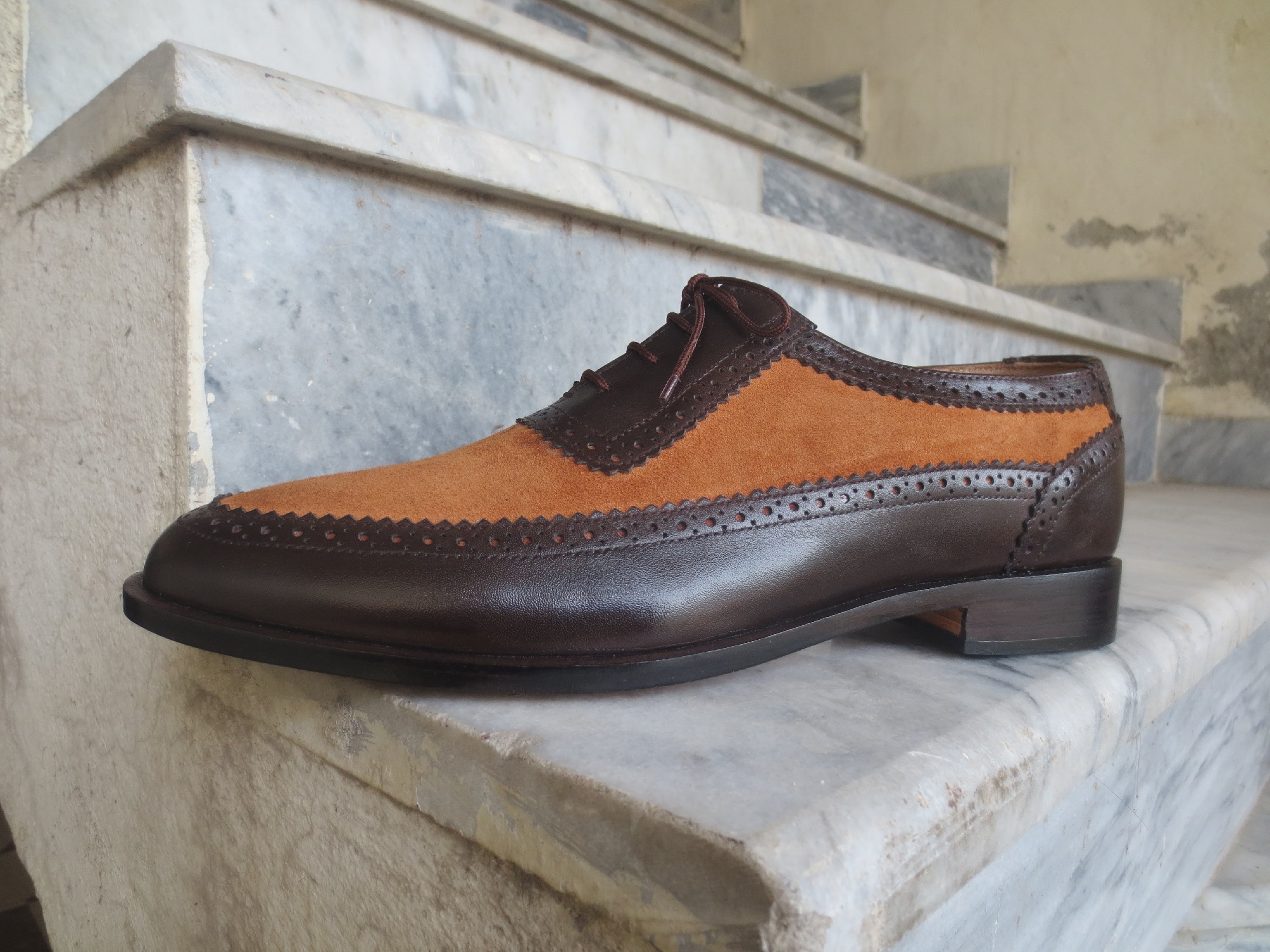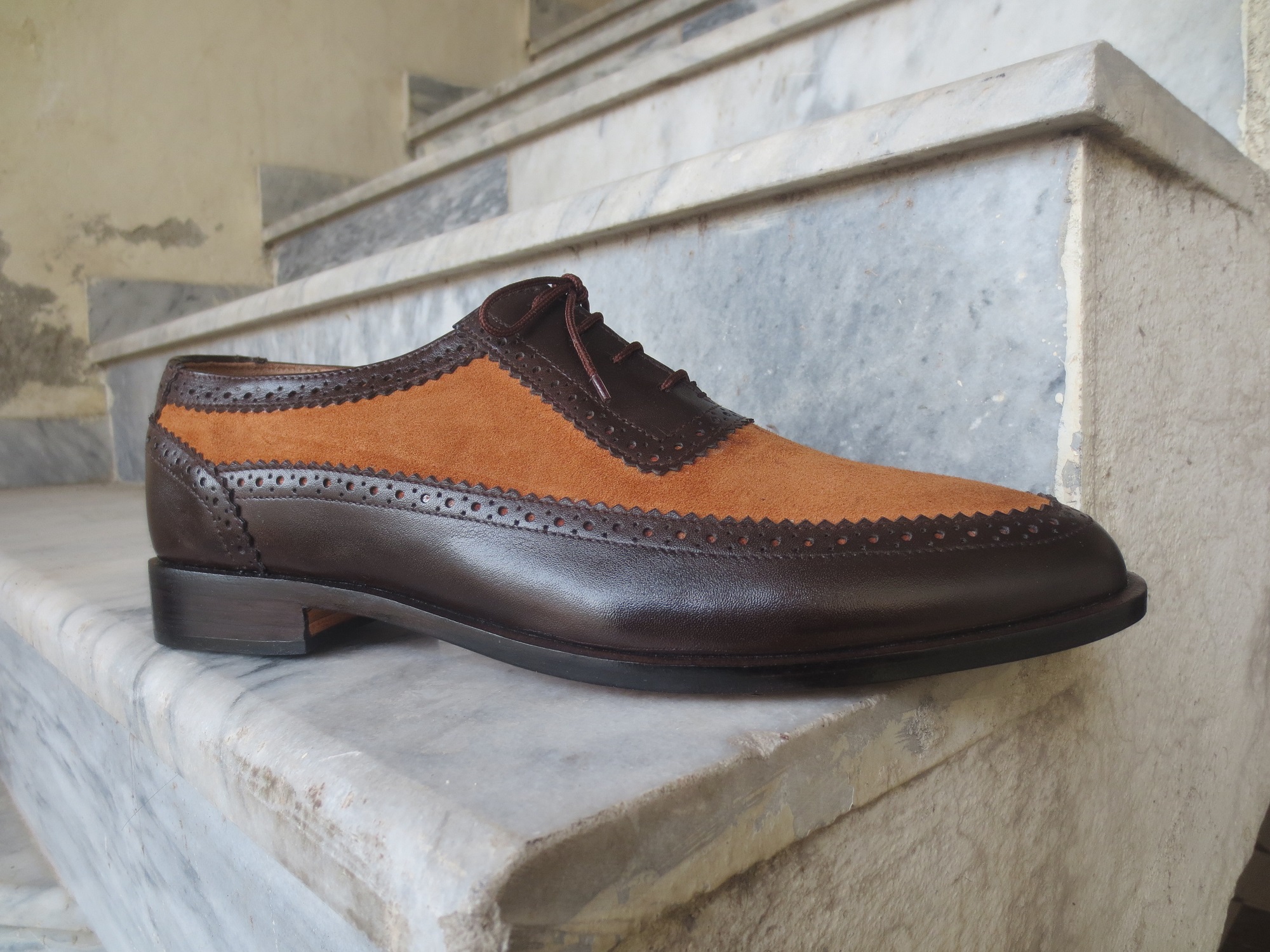 Handmade Mens Casual Shoes, Mens Tan Brown Leather & Suede Lace Up Casual Shoes.