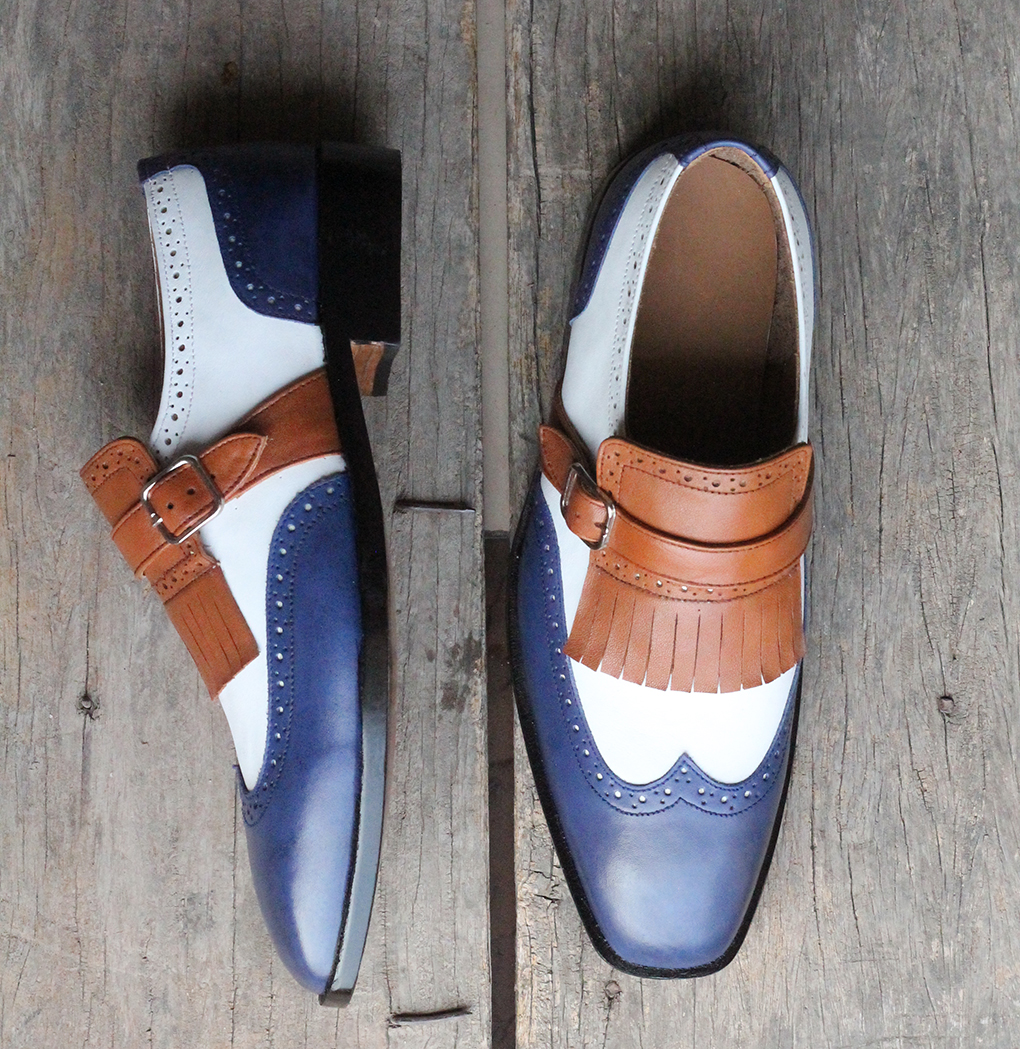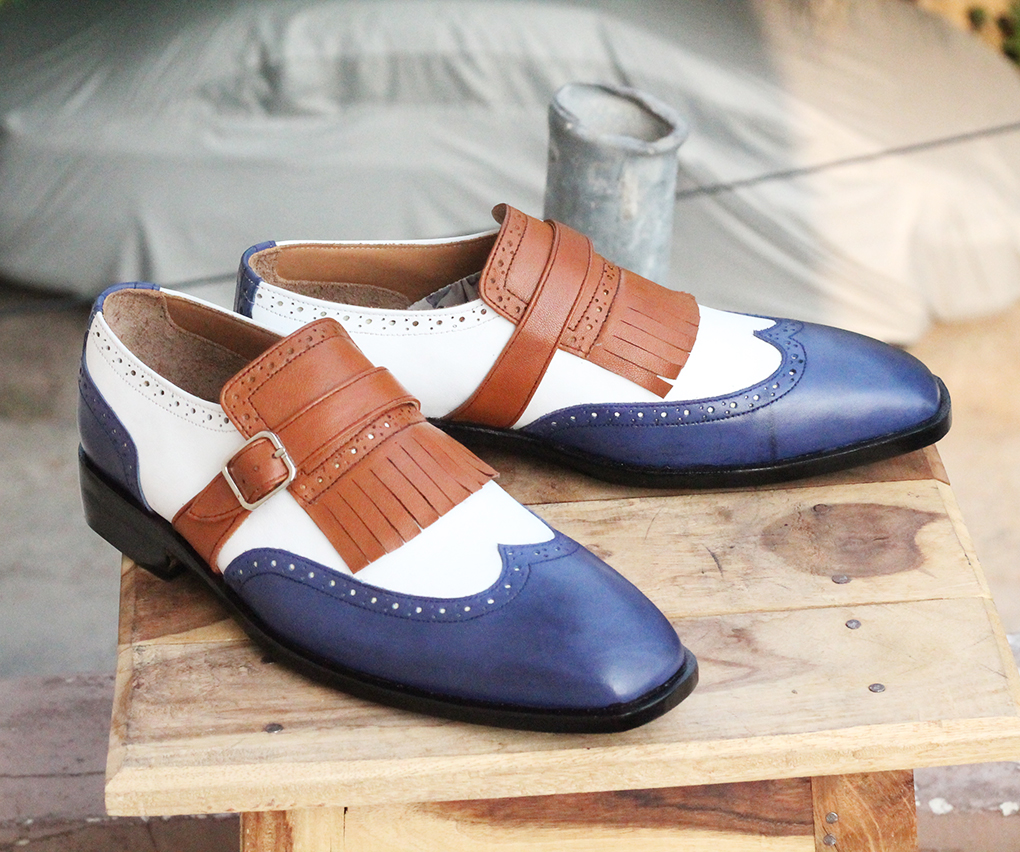 Handmade Mens Blue White Brown Leather Fringe Slip On Loafers Wing Tip shoes