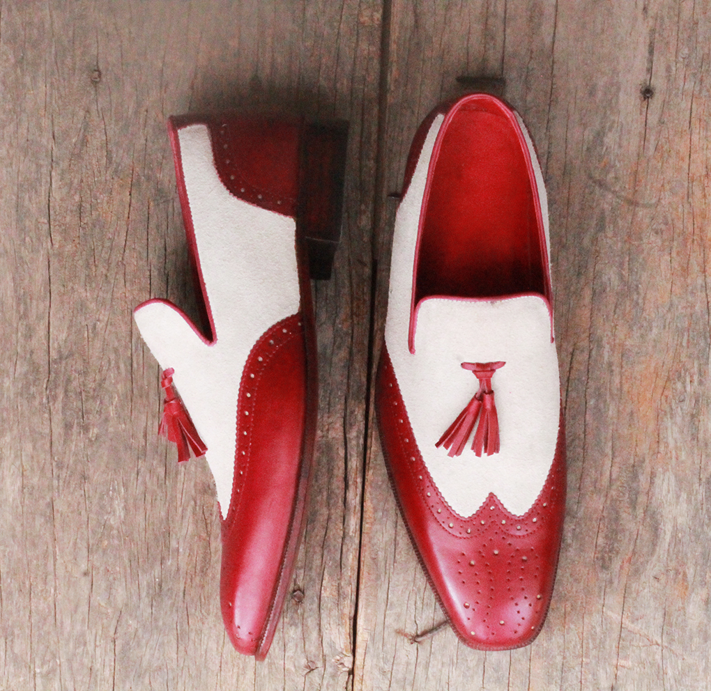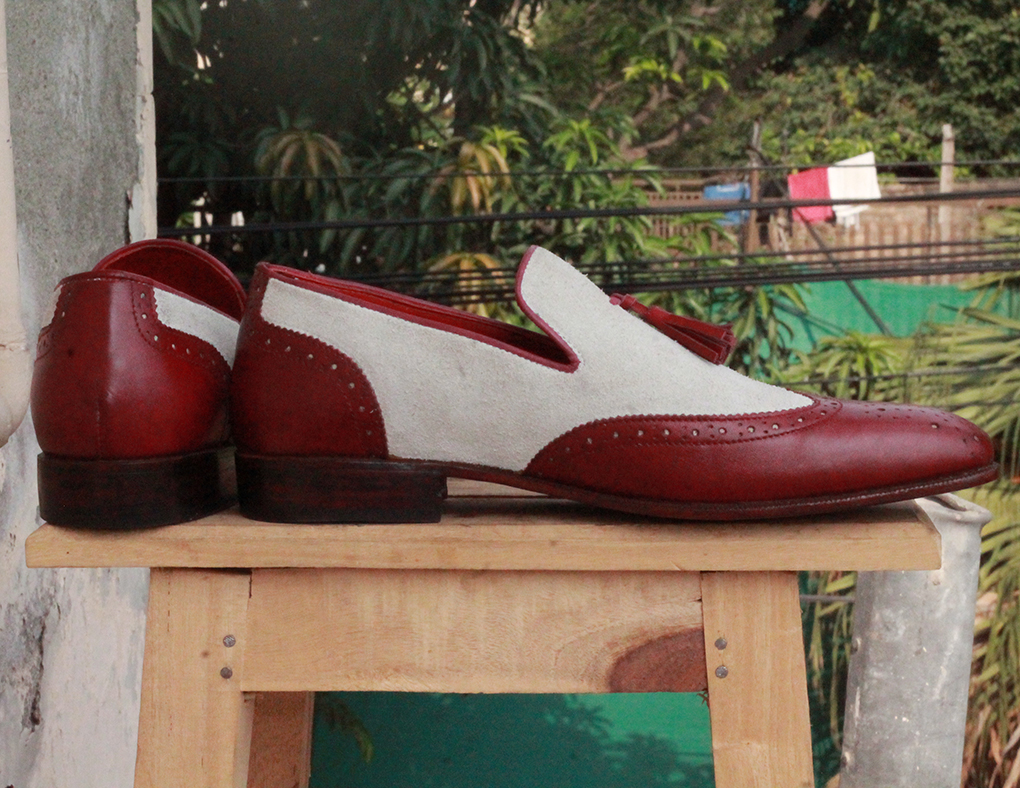 Mens Handmade White Burgundy Leather Suede formal shoes Slip On Slippers Wing Tip Brogue Tussles Shoes