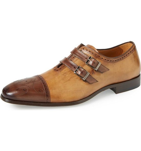 Mens Double Monk Straps Shoes, Beige Brown Handmade Designer Cap Toe Brogue Shoes
