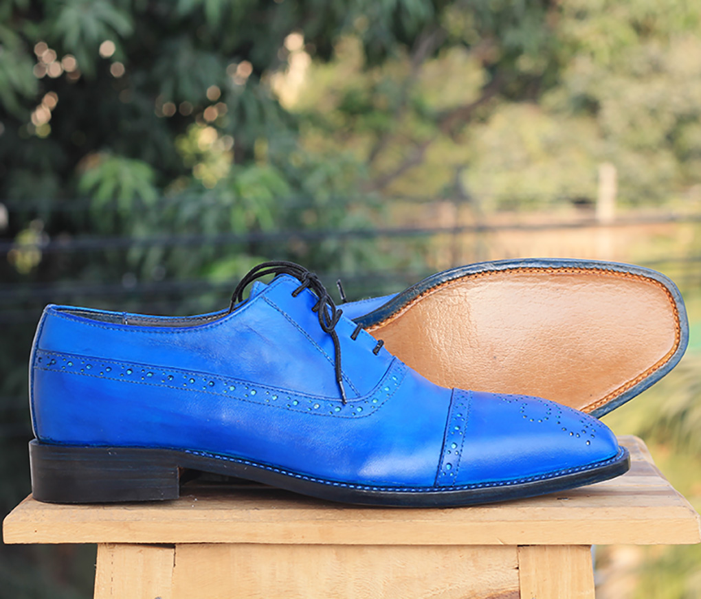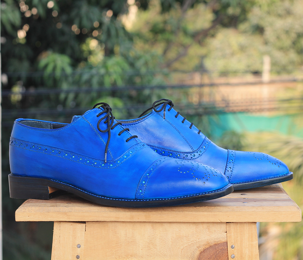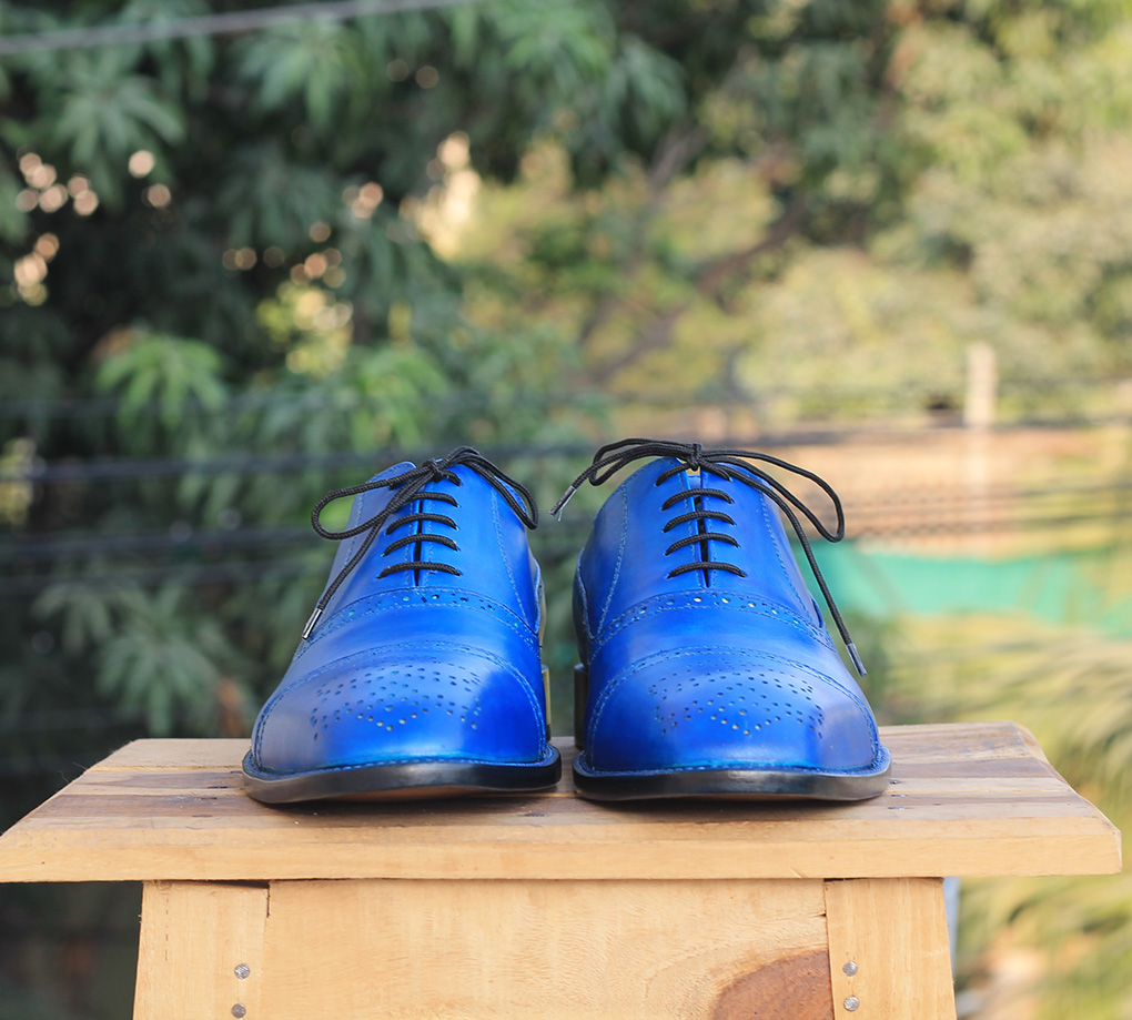 Blue oxford leather shoes. Handmade Men Formal Brogue Shoes