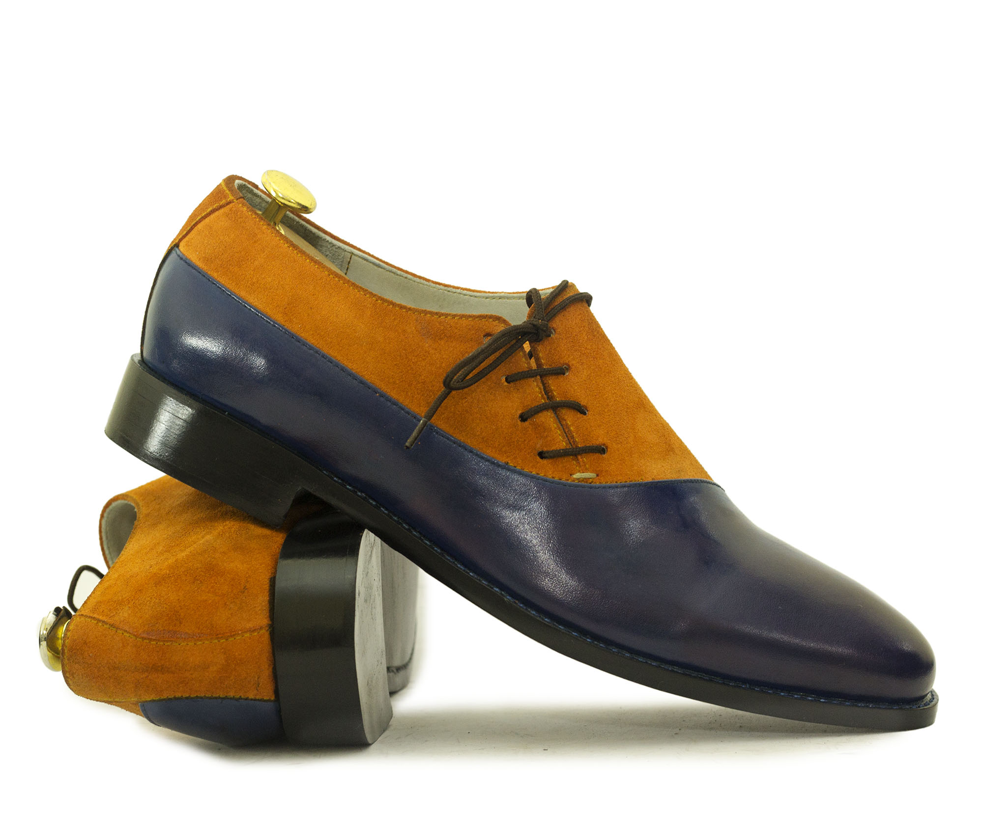 Handmade Mens Casual Shoes, Mens Tan Brown Blue Leather & Suede Lace Up Casual Shoes.
