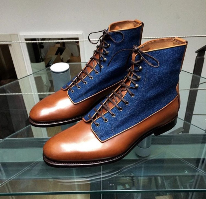 Handmade Leather Tweed Boot, Ankle High Blue Brown Men's Lace Up Dress Boot