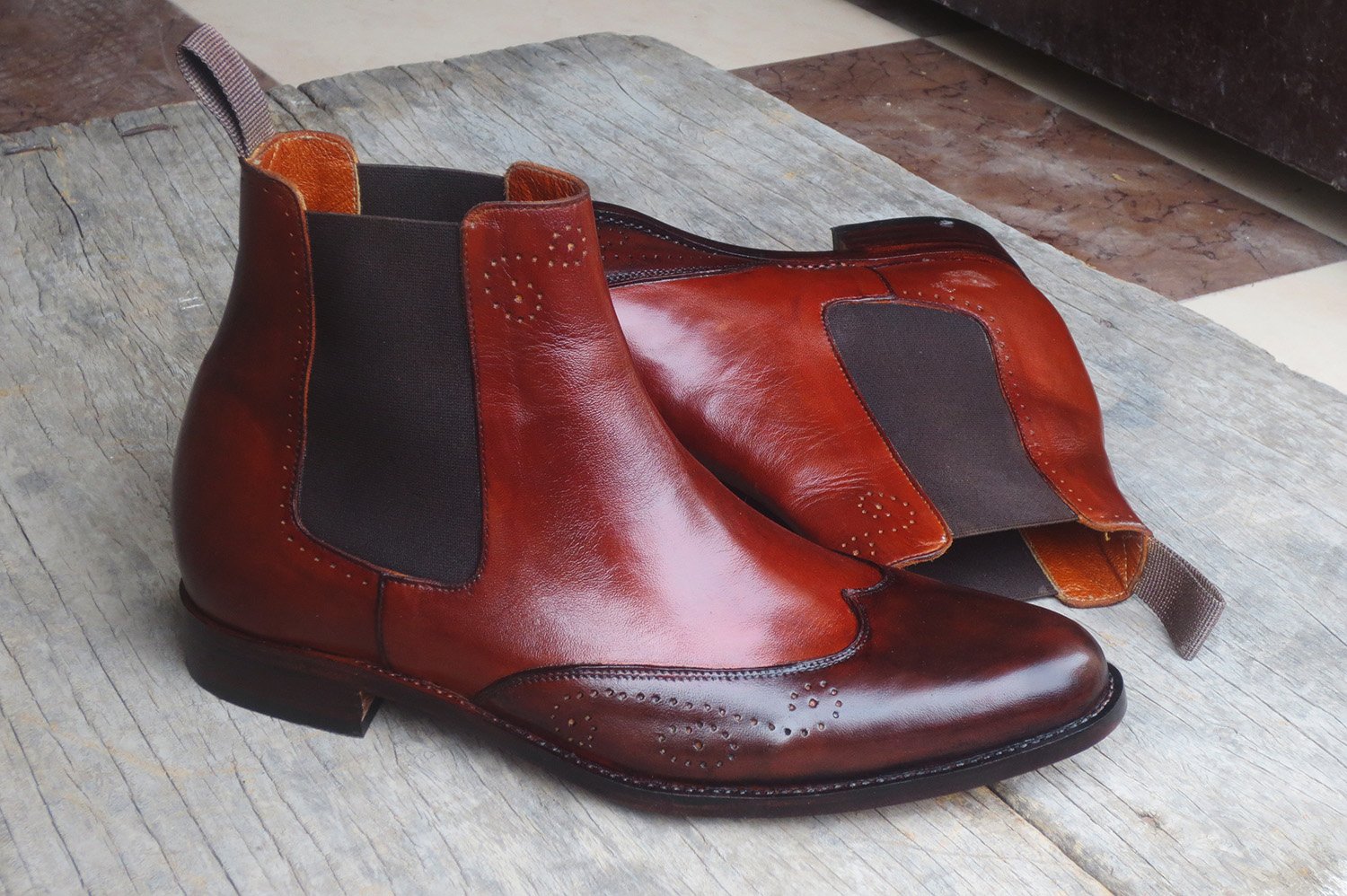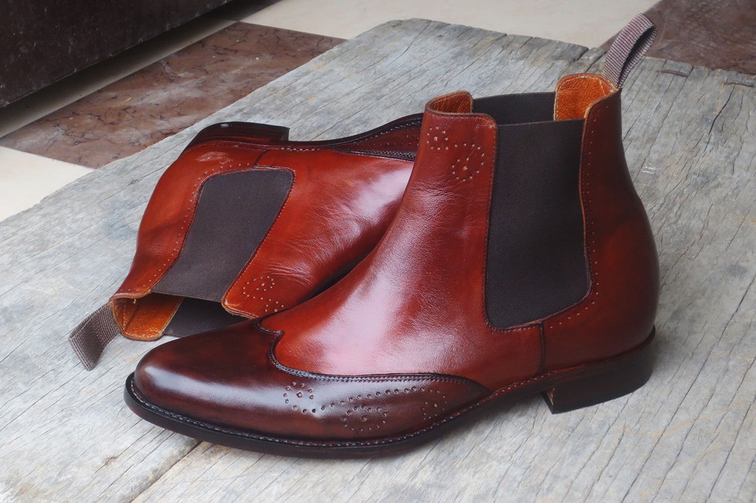 Brown Leather Wing Tip Chelsea Boots. Mens High Ankle Boots. Mens Boots