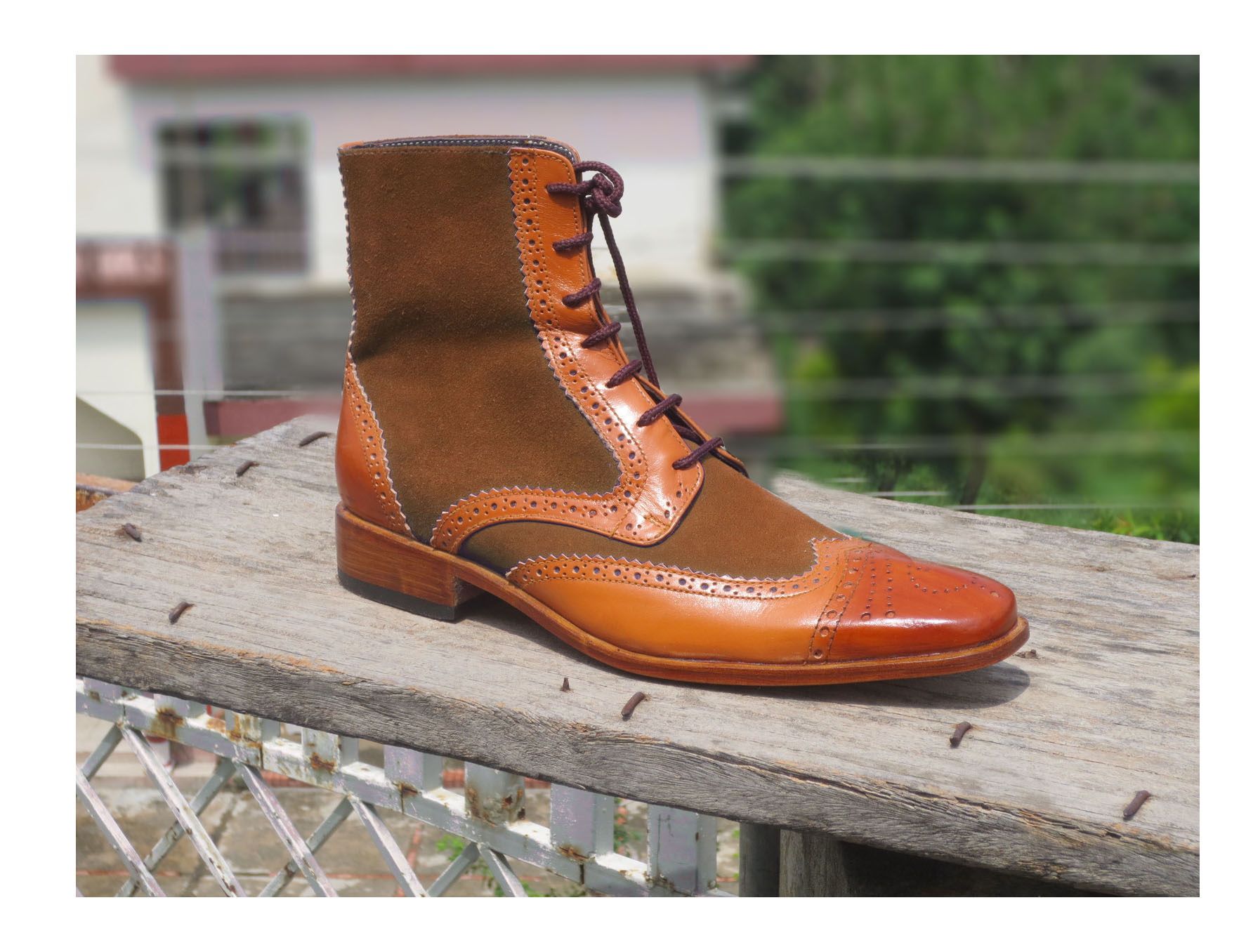 Handmade Mens Ankle High Boot, Mens Tan Brown Leather & Suede Wing Tip Lace Up Casual Boot.