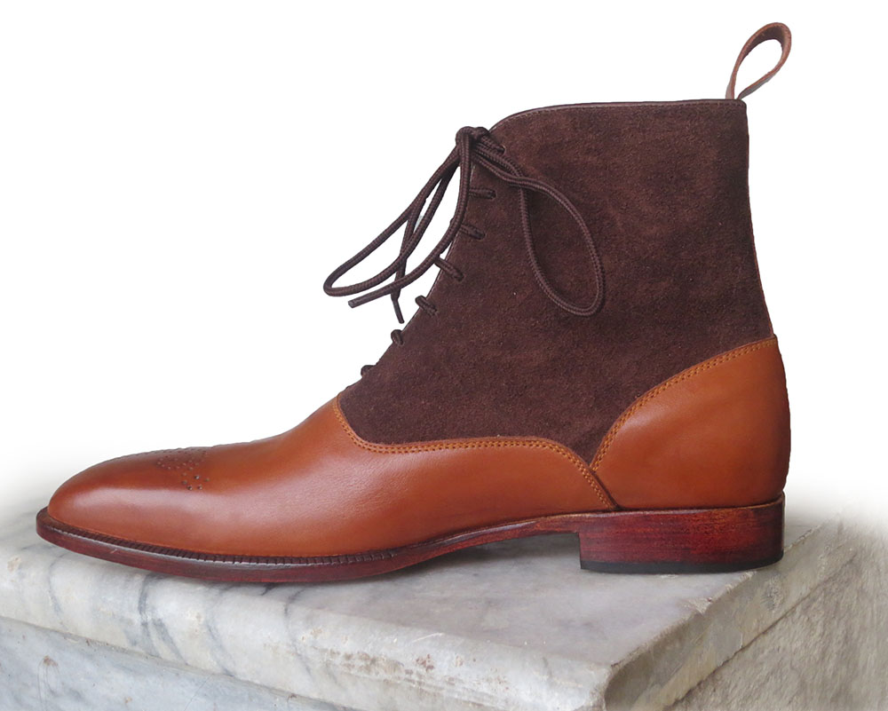 Handmade Mens Ankle High Boot, Mens Tan Brown Leather & Suede Lace Up Casual Boot.
