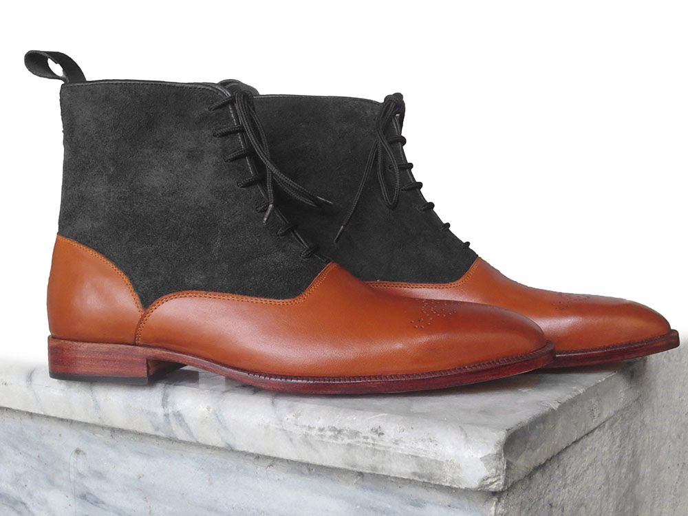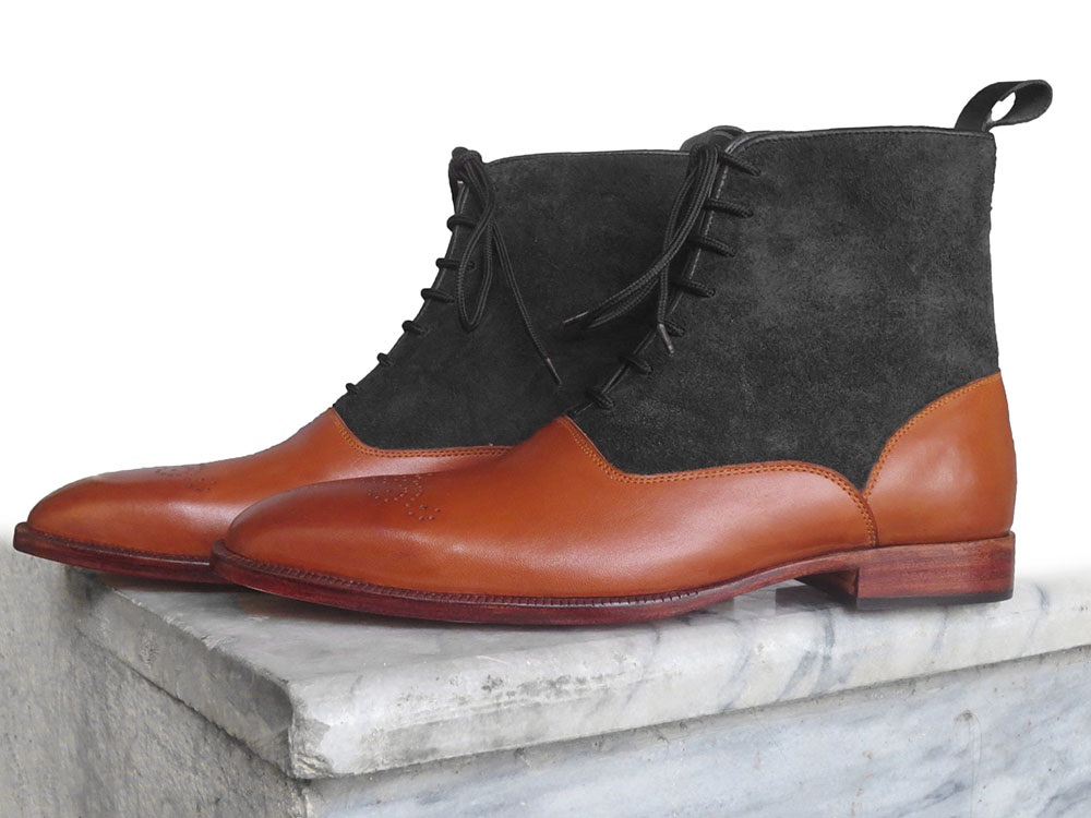 Handmade Mens Ankle High Boot, Mens Black Tan Leather & Suede Lace Up Casual Boot.