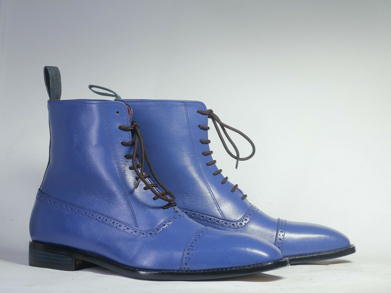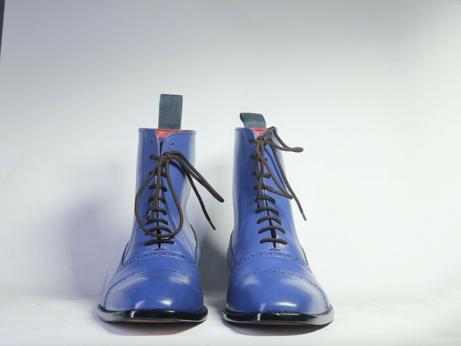 Mens Blue Cap Toe Leather Ankle Boots. Men Dress Formal Fashion Boot