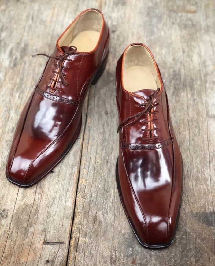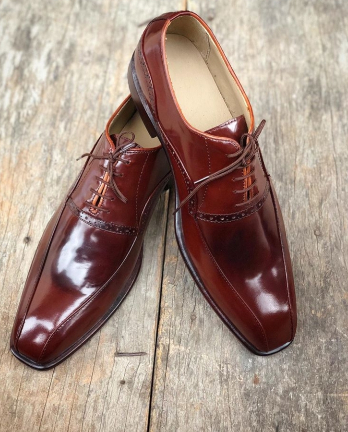 Handmade Mens Brown Patent Derby Shoes Formal Dress Lace up Shoes