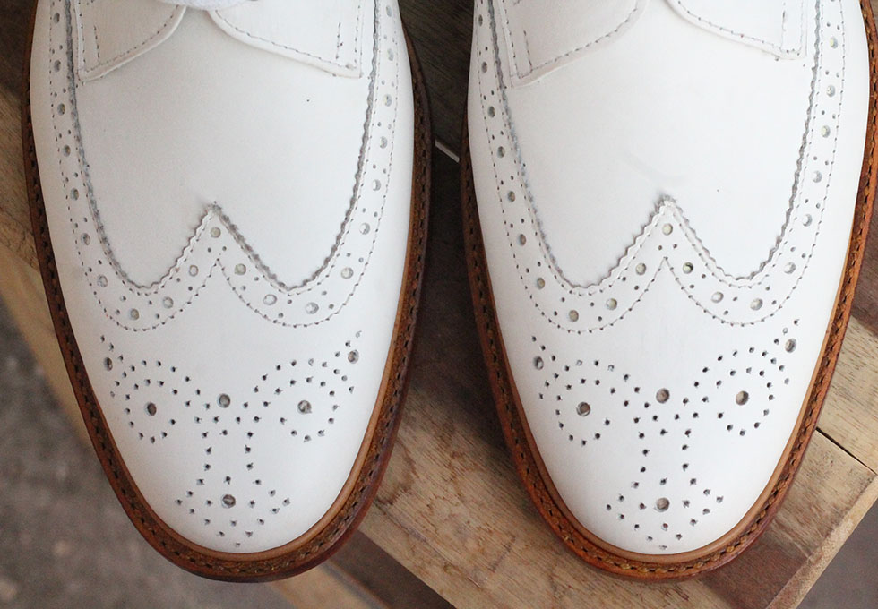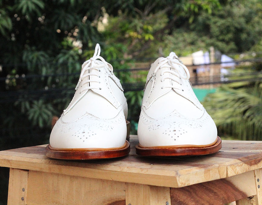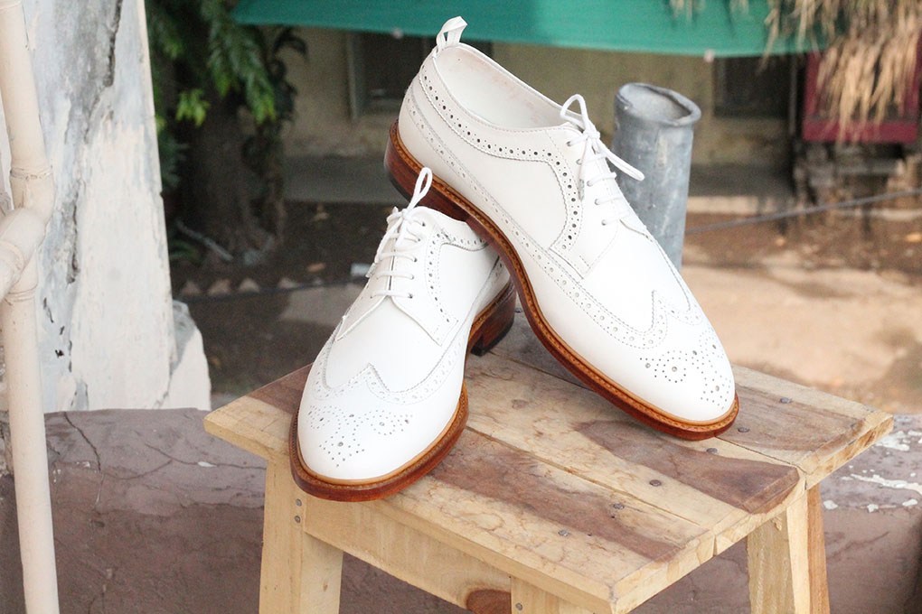 White Leather Wing Tip Brogue Shoes. Handmade Brogue Lace Up Dress Shoes.