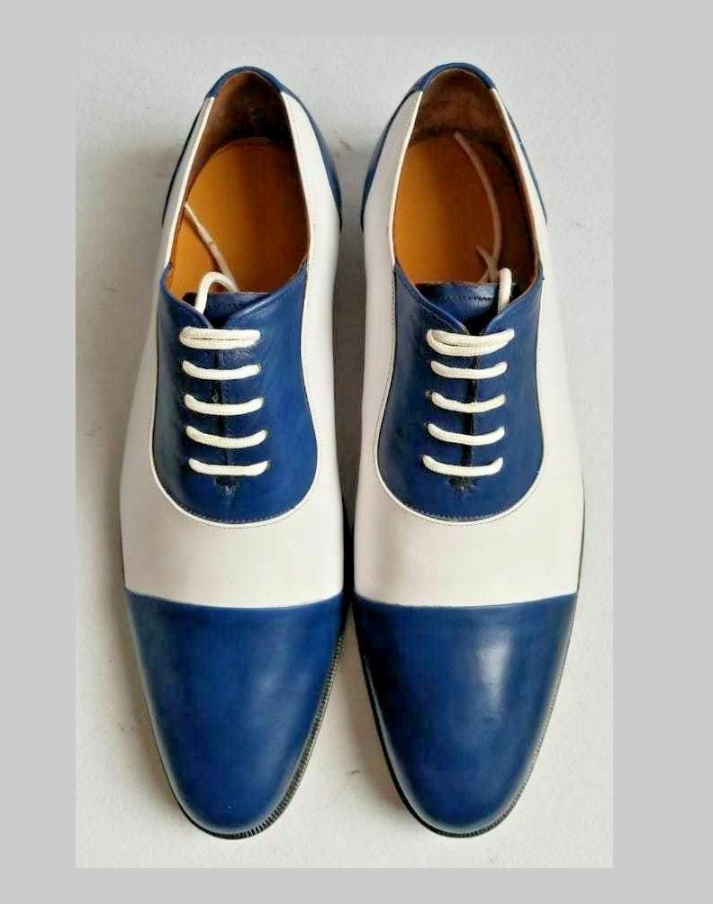 Handmade Blue White Lace Up Leather Shoes, Cap Toe Dress Formal Shoes
