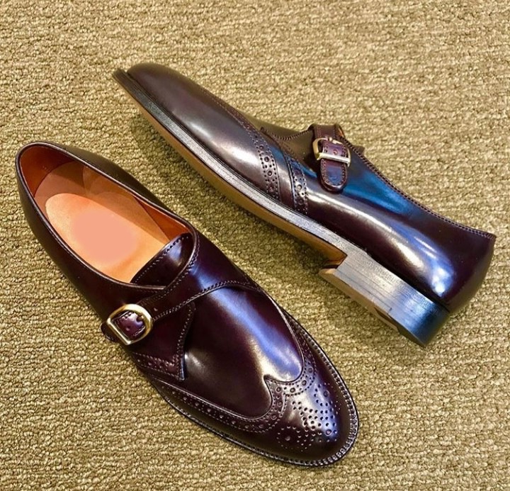 Handmade Leather Maroon Monk Strap Wing Tip Brogue Formal Shoes