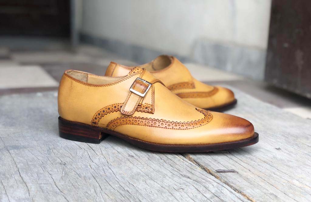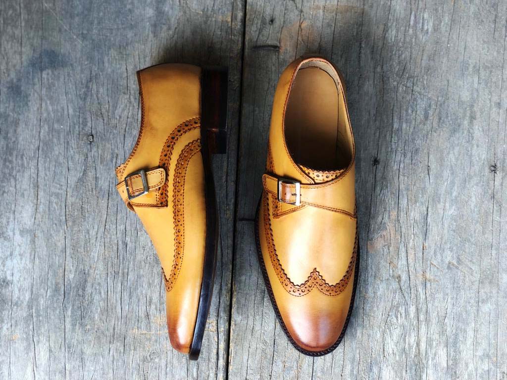 Leather Mens Tan Color Single Monk Strap Dress Formal Wing Tip Shoes