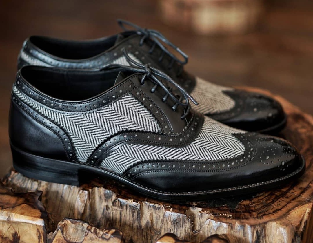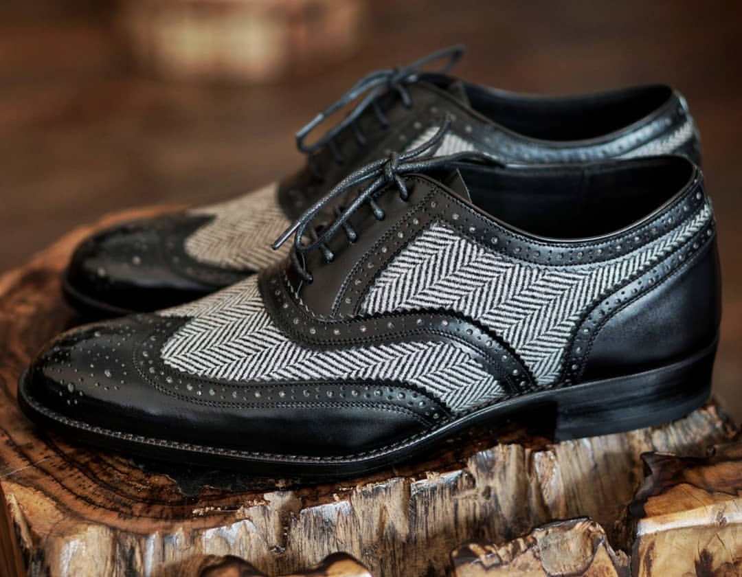 Handmade Mens Black Leather & Tweed Wing Tip Lace Up Casual Shoes