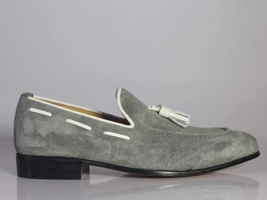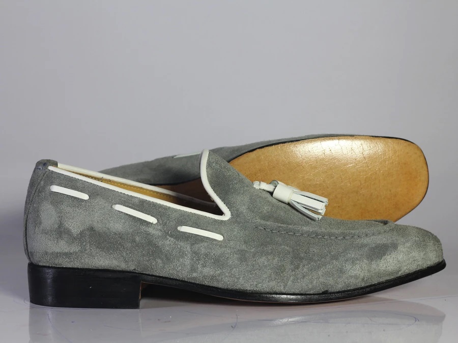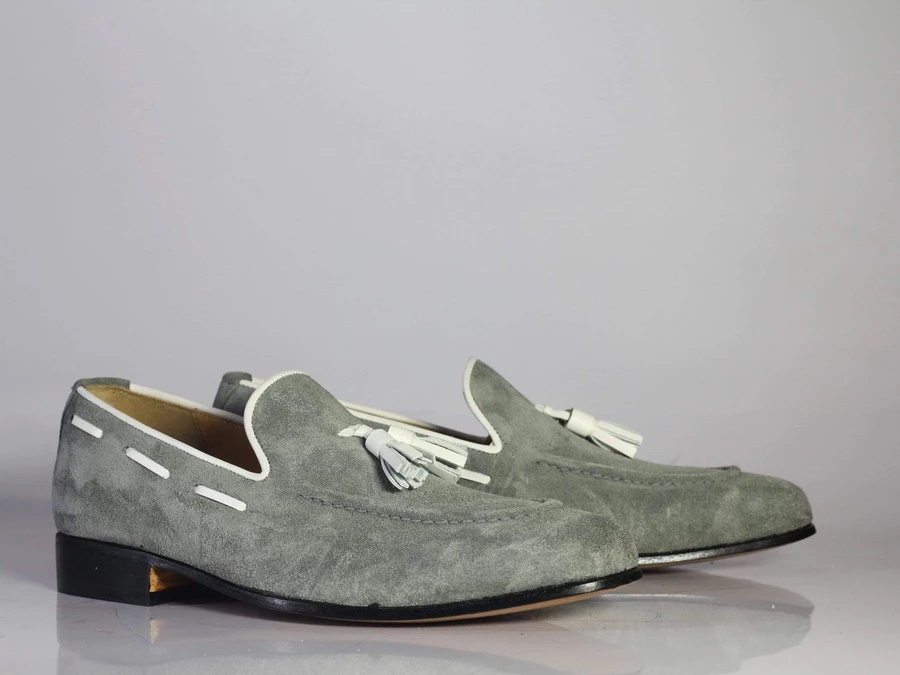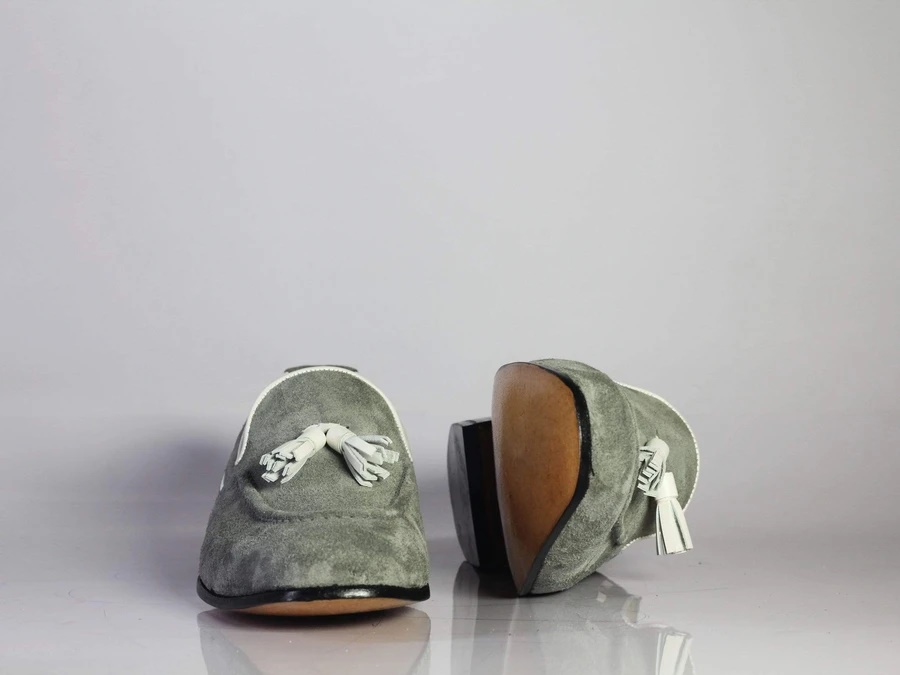 Handmade Grey Round Toe Tussle Suede Loafers for Men. Shoes for men