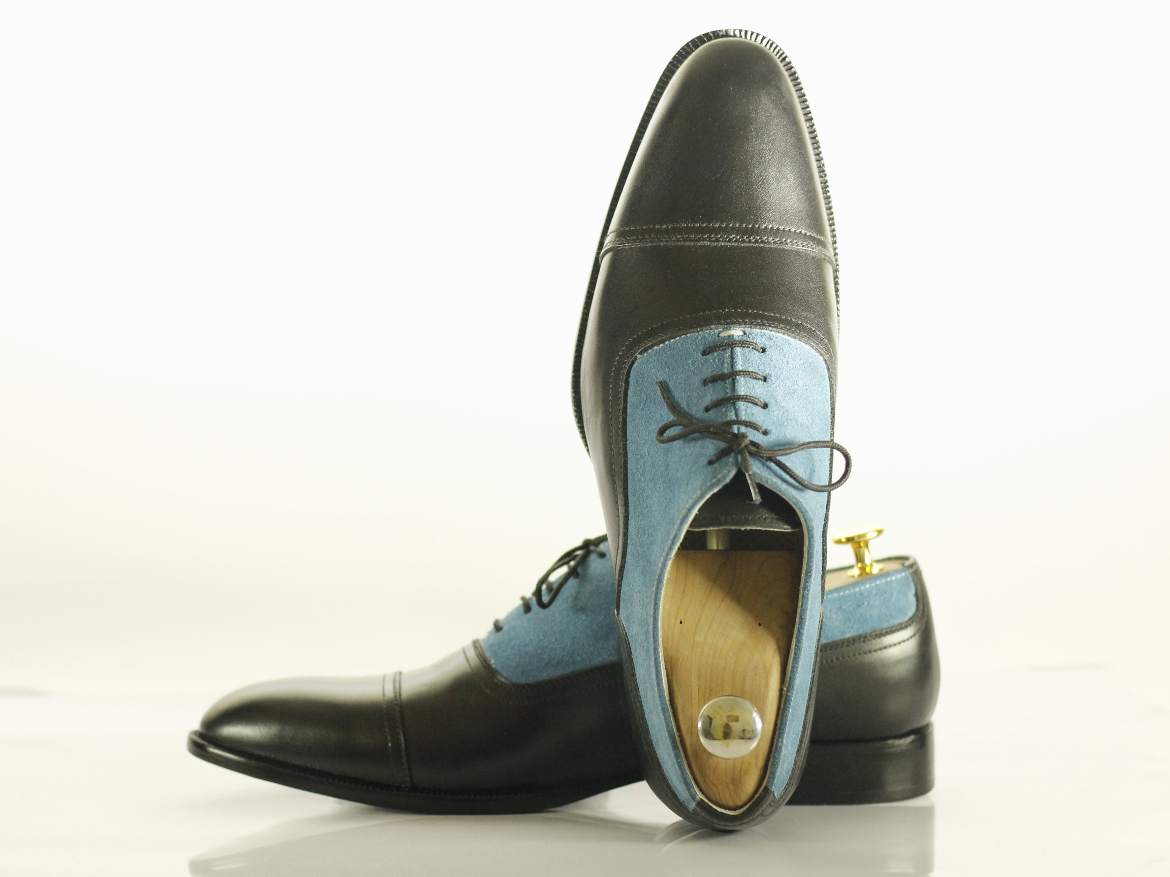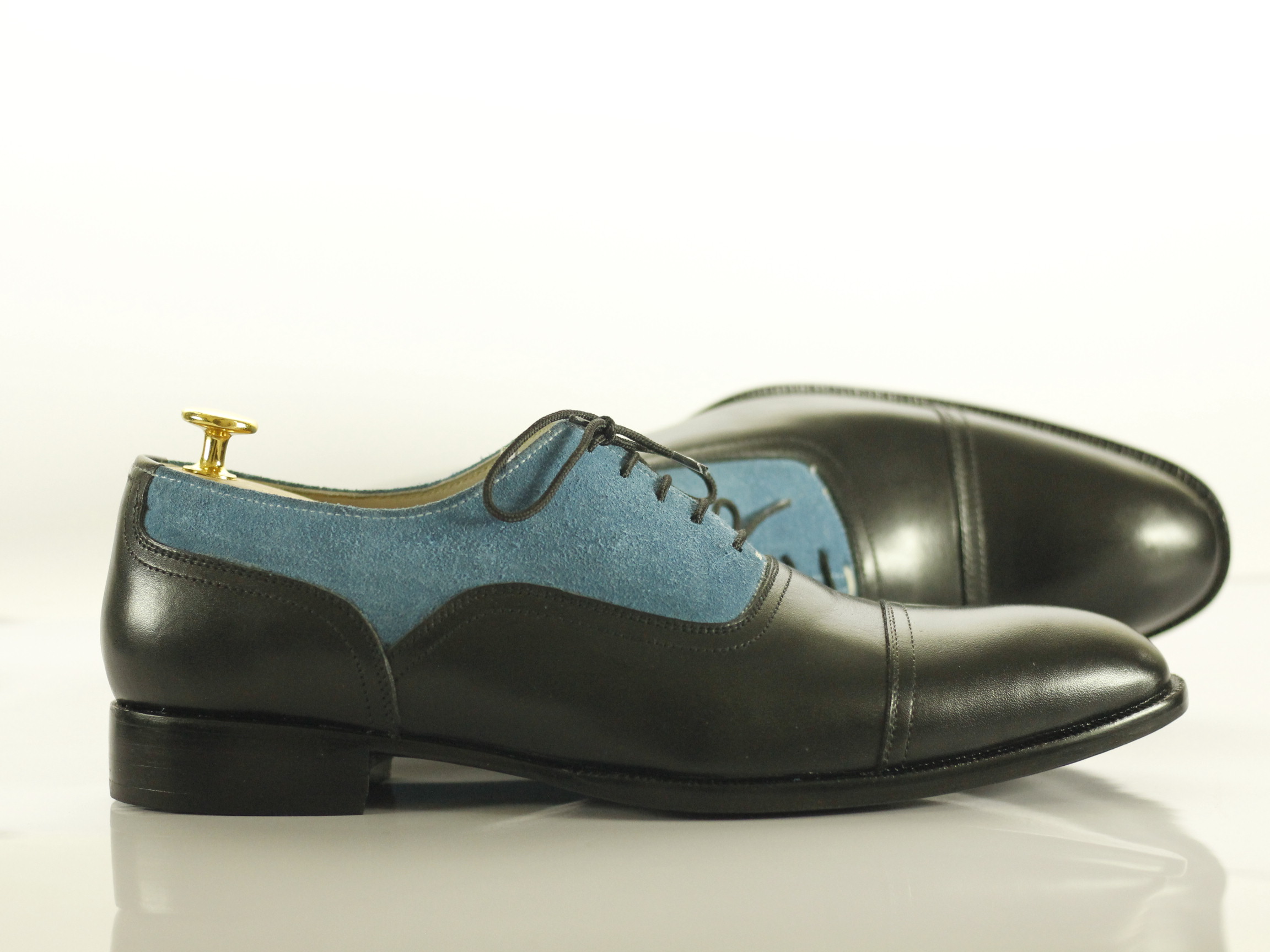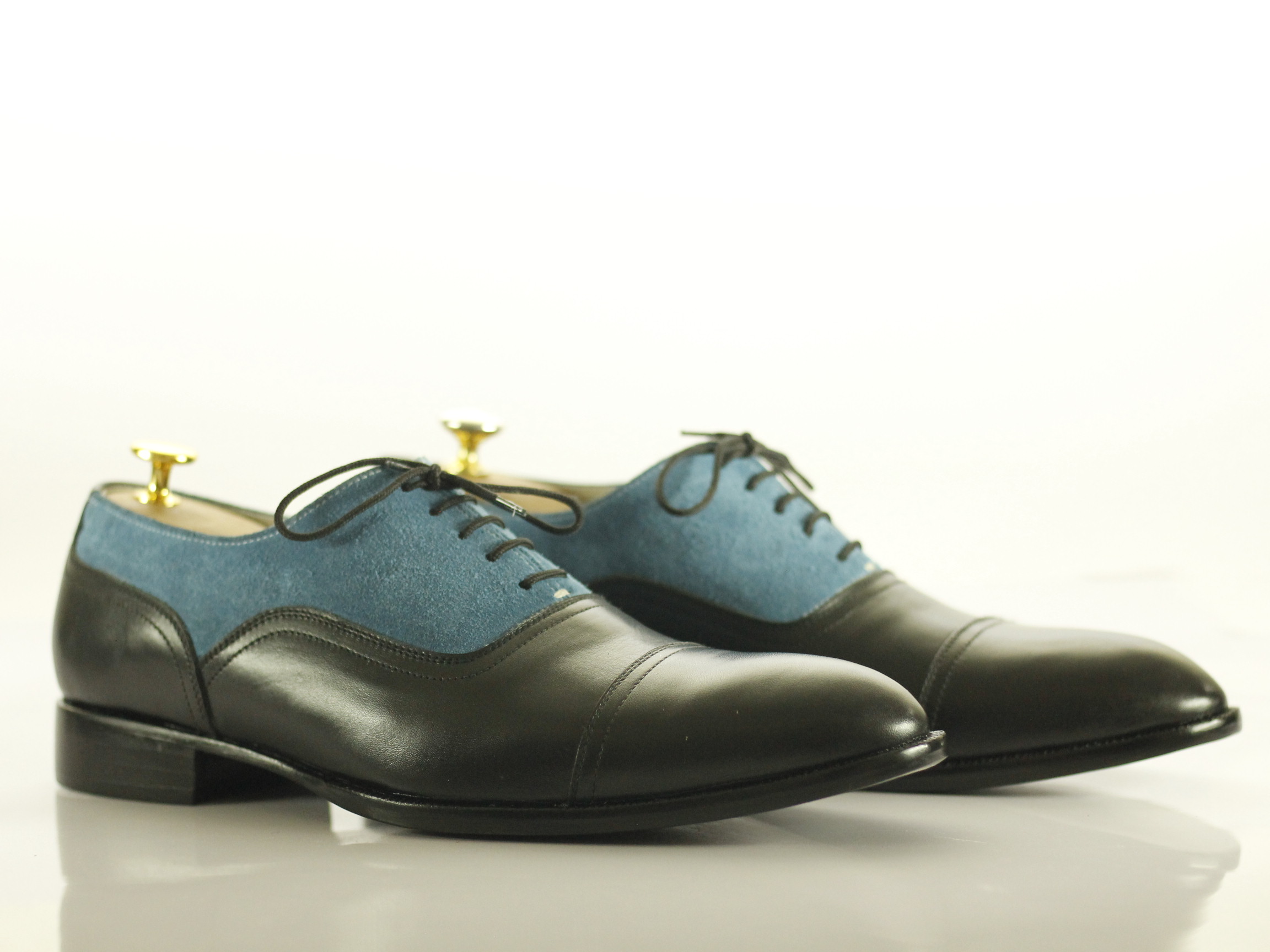 Handmade Mens Black Navy Blue Suede Leather Lace Up Shoes. Mens Dress Cap Toe Shoes