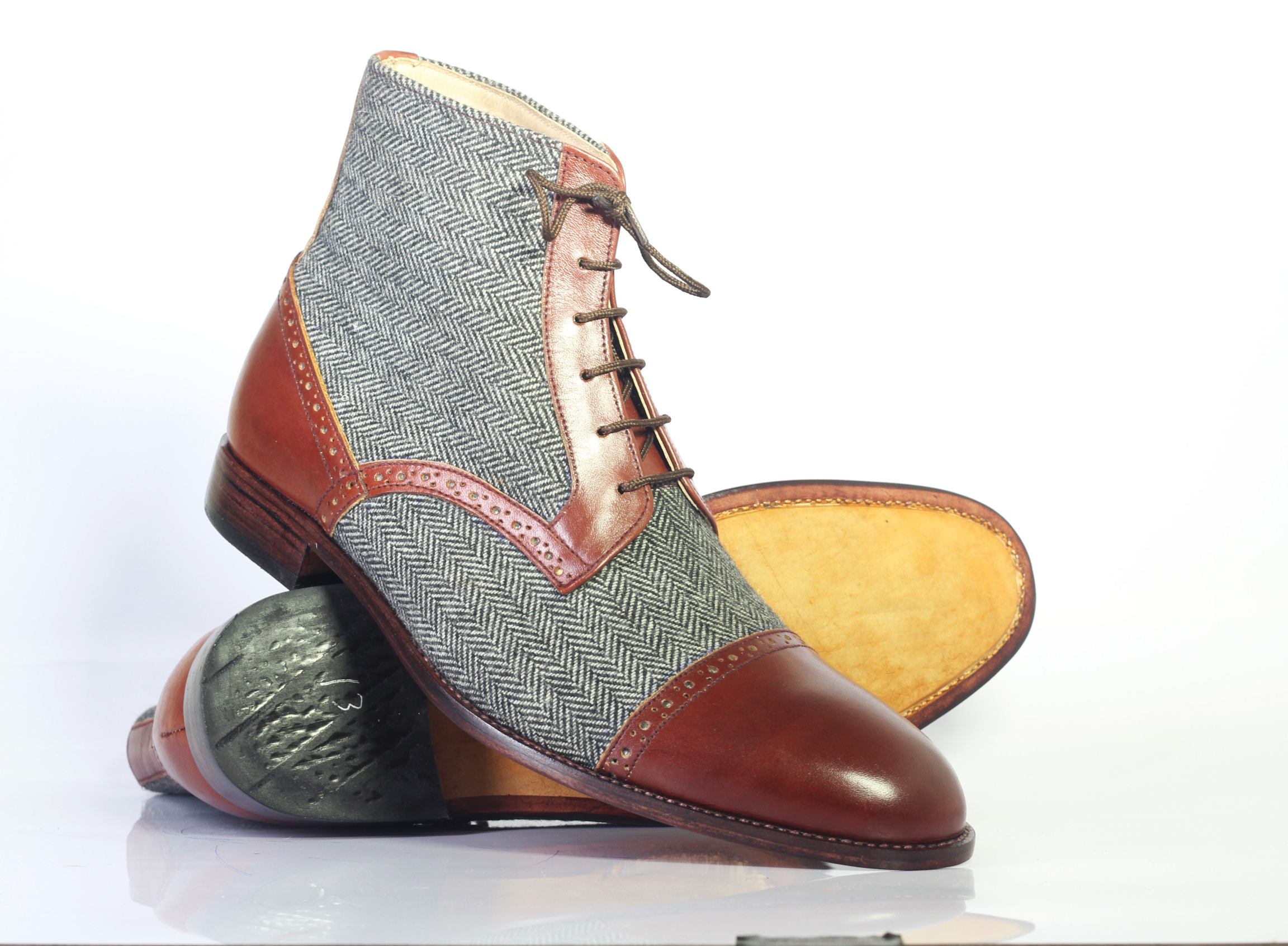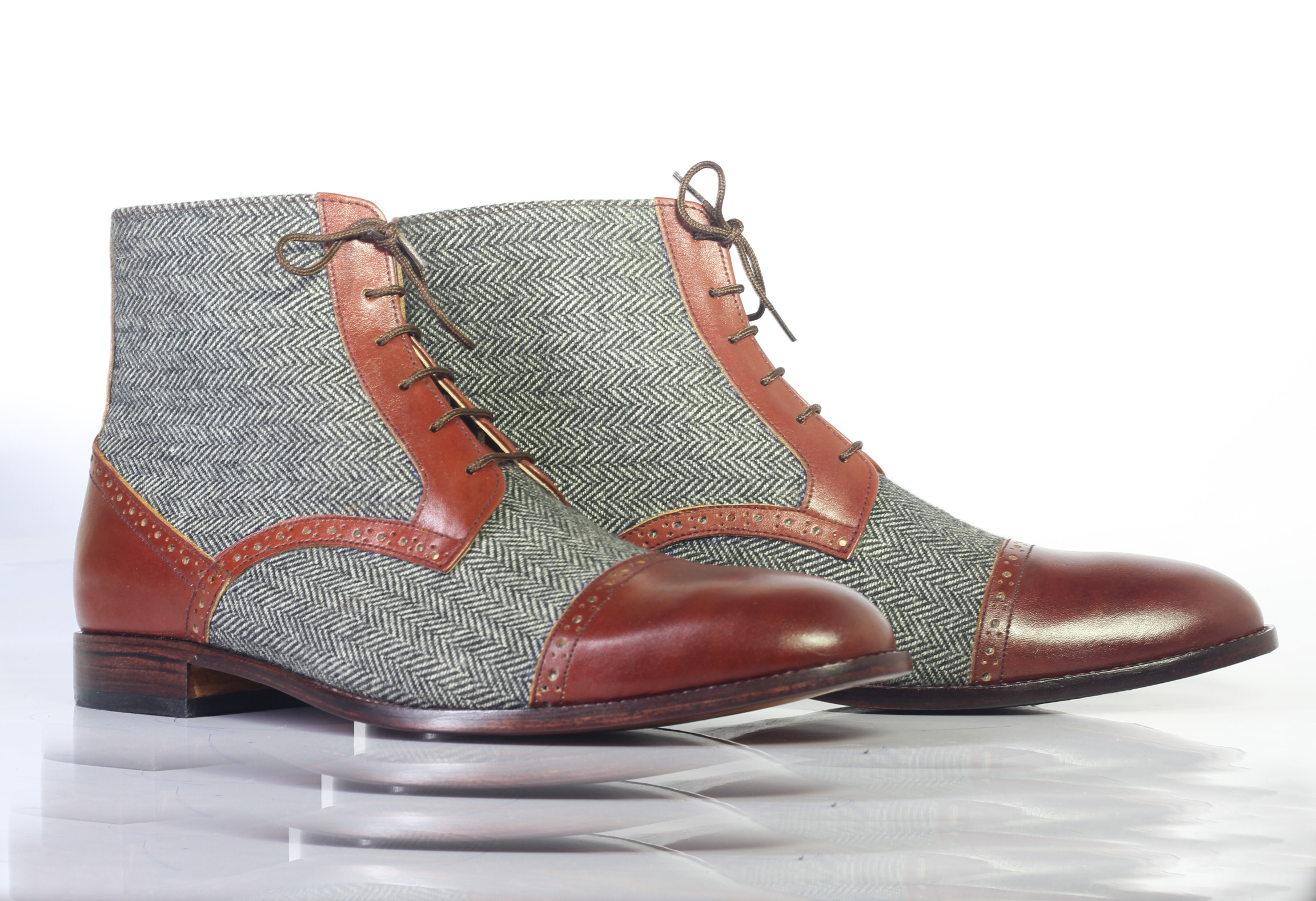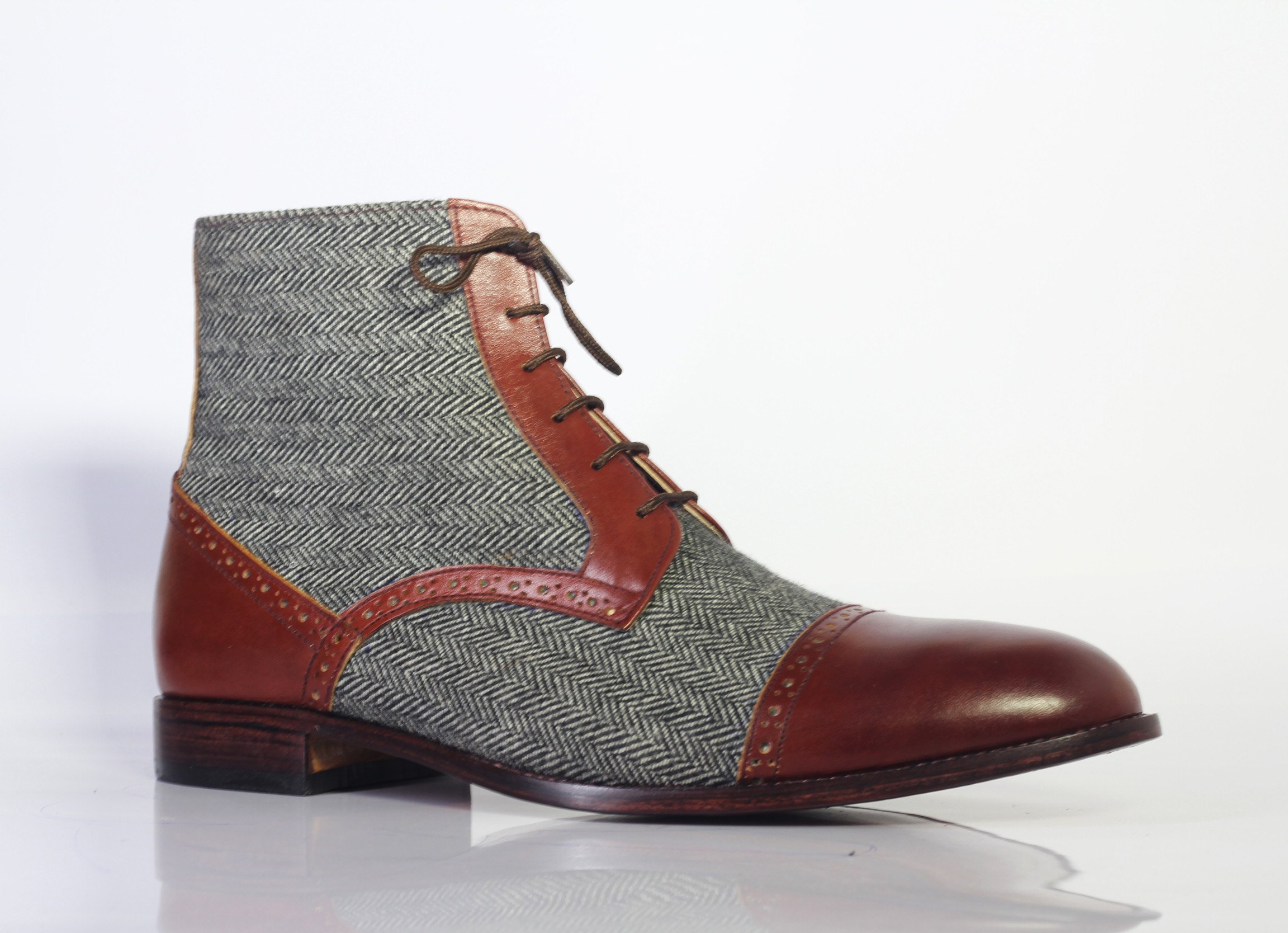 Handmade Two Tone Cap Toe Lace Up Leather & Tweed Boots. Mens Ankle High Boots