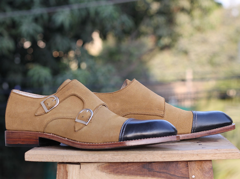 Mens Handmade Beige Black Cap Toe Double Monk Strap Leather Suede Shoes