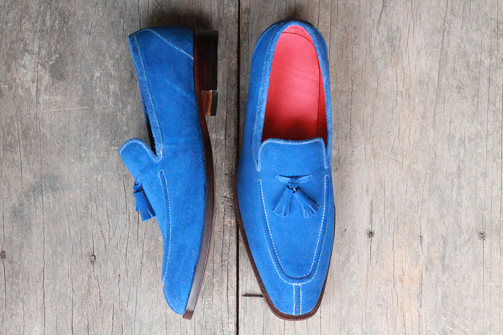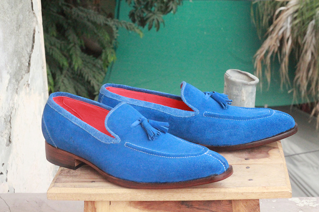 Mens Handmade Blue Suede Split Toe Shoes, Tussles Loafers Moccasin