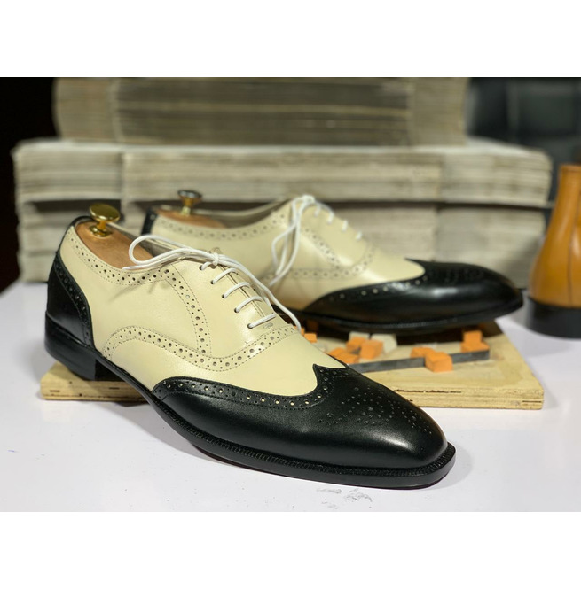 Handmade Wingtip Oxford black and white Color Shoes, Mens Leather Dress Formal Shoes